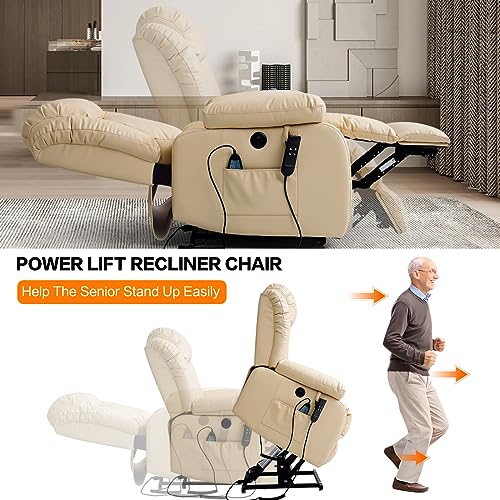 COCOLHOME Infinite Position Power Lift Chair Lay Flat Recliner Dual Motor Sleeper Chair with Massage and Heating for Elderly, USB Ports and Remote Control, Genuine Leather(Beige)