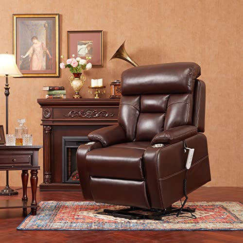 Creatuis Lift Chair with Adjustable Lumbar Support,Power Lift Recliner Chair for Elderly,Lays Flat,Three OKIN Motor,Cup Holder,Faux Leather(Brown)