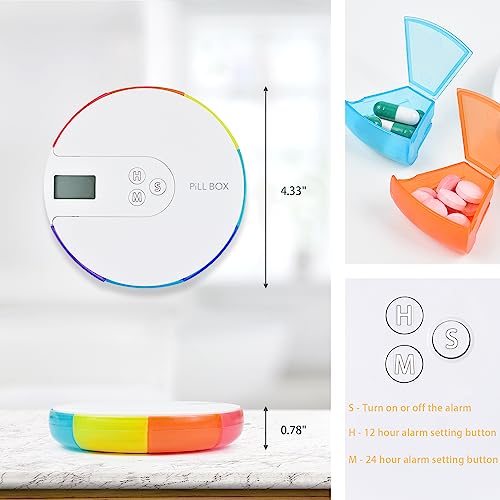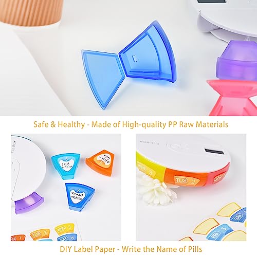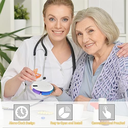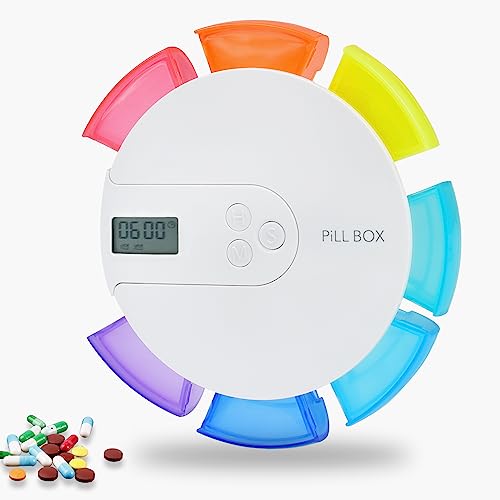 【Full Treatment Resolution】Computerized capsule dispenser for the aged with alarm contains an digital capsule field dispenser with a rainbow-colored design. It comes with seven particular person compartments, offering a full week’s medicine provide.