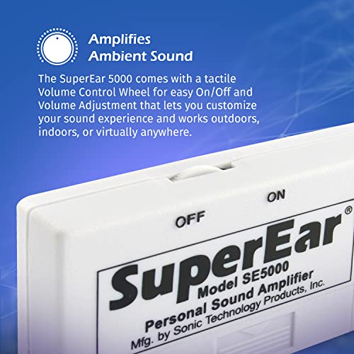 PERSONAL SOUND AMPLIFIER: The SuperEar SE5000 has surface mount microelectronics for crystal clear amplification of ambient sounds by up to 50 decibels, for a total decibel gain of 107 dB. It comes with a short highly sensitive compact microphone, and boasts up to 30 hours of battery life. The tactile volume control wheel lets you customize your sound experience and works outdoors, indoors, or virtually anywhere!