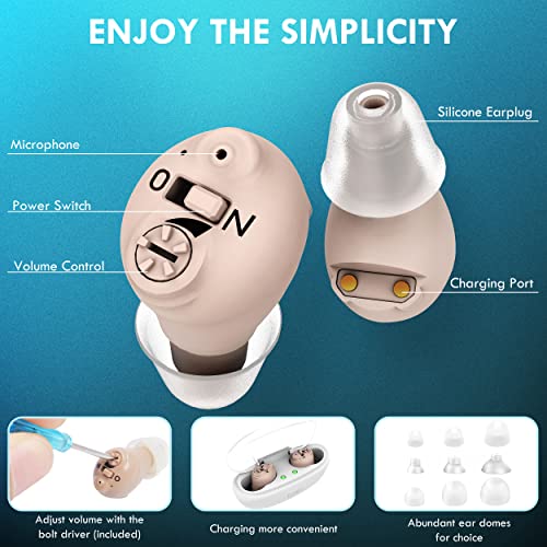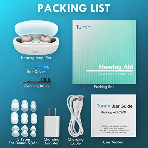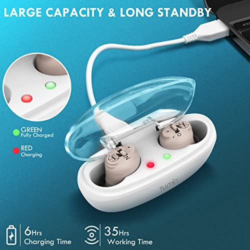 Specification: Tumin Rechargeable Hearing Aids for Seniors, Completely-in-Canal Invisible Hearing Amplifiers Earbuds for Elderly, Noise Cancelling Hearing Assist with Magnetic Contact Charging Box